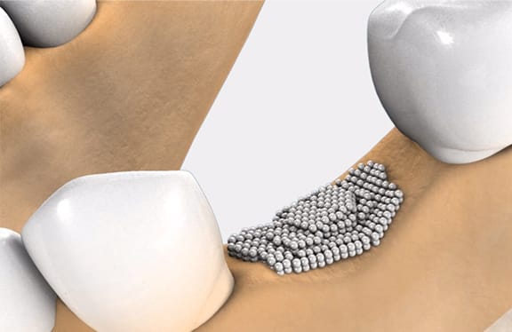 When a tooth is lost, both bone and gum tissue compete for the vacant space. The gum tissue generates more quickly than bone, subsequently occupying the space. With a membrane placement we can keep the gum tissue from invading the space, which will ideally give the bone sufficient time to regenerate. Bone regeneration is often used to rebuild the supporting structures around the teeth, which have been destroyed by periodontal disease. Bone surgery may be used to attempt to rebuild or reshape bone. Grafts of the patient's bone or artificial bone may be used, as well as special membranes.