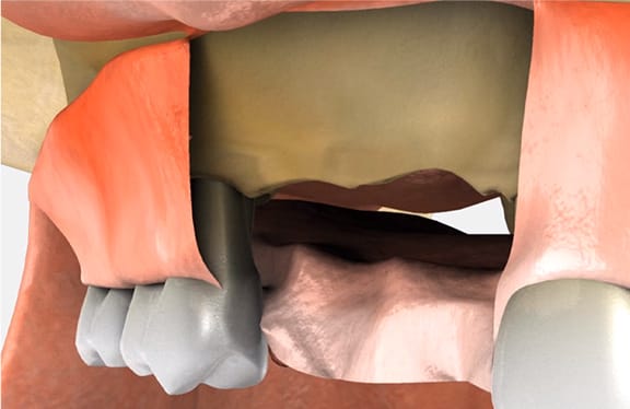 The human skull has several cavities or air spaces called sinuses. When the sinus is enlarged and intrudes on areas where we want to place dental implants, bone or bone growth stimulation material is placed into the sinus. This procedure only affects the maxillary sinuses, which are located just over the molar teeth in the upper jaw. The side of the maxillary sinus is opened and the bottom is raised so it will fill in with bone. Several months later, dental implants can be placed in solid bone.