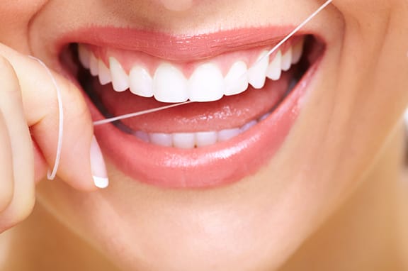 Because your toothbrush won't reach between your teeth, brushing alone won't keep your teeth clean and healthy. Flossing can help. A floss threader, available from us or a pharmacy, helps you floss with braces on. Floss once a day, like this:
